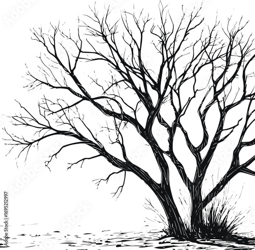 © MdRubel, Obraz premium Desert tree outline with dry branches, simple black contour line art on white background.
