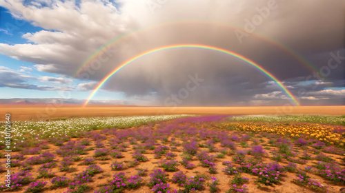 © MSTRUKSANA, Naklejka premium Desert valley with double rainbow and blooming wildflowers