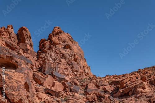 Fototapeta premium Desert varnish, red Aztec Sandstone outcrops, Early Jurassic geological formation of primarily eolian sand. ,Valley of Fire State Park, Clark County, Nevada geology.