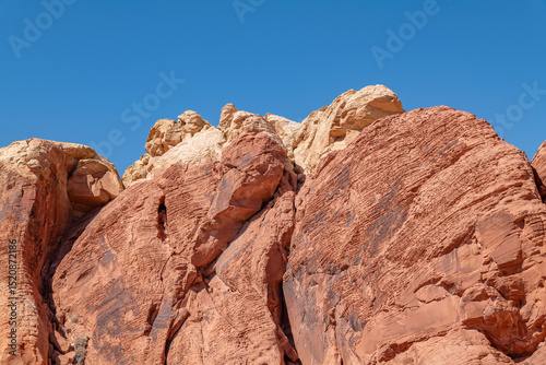 Obraz premium Desert varnish, red Aztec Sandstone outcrops. Rainbow Vista Trail, Valley of Fire State Park, Clark County, Nevada geology. Weathering joints