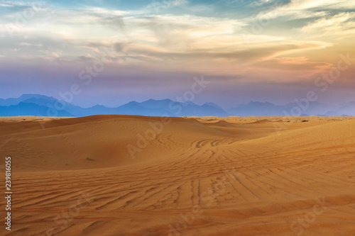 © adrian_ilie825, Fototapeta premium Desert with sand dunes at sunset, wilderness desert landscape or panorama