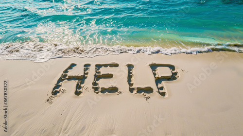 © scaliger, Fototapeta premium Deserted beach of uninhabited tropical island, sand with inscription HELP from lost in sea. Aerial view of empty ocean shore. Concept of shipwreck, sos, castaway, message