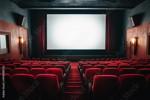 © Mitya, Fototapeta premium Deserted cinema featuring vibrant red seating and a large bright white projection screen