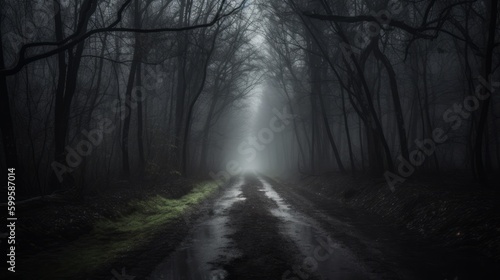 © vadymstock, Naklejka premium Deserted dark forest road. AI generated.