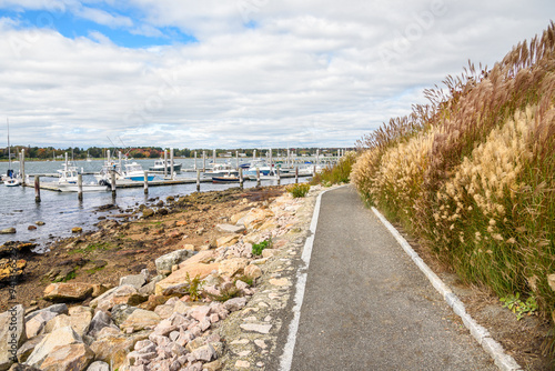 Fototapeta premium Deserted footpath alongside a natural harbour on a cloudy autumn day. Boats...