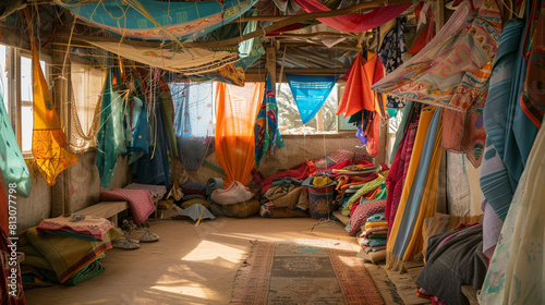 © Muhammad, Fototapeta premium Deserted kite-making workshop shed with colorful fabrics and strings, ready for crafting but motionless.