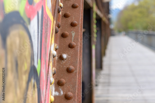 © michaelheim, Obraz premium Deserted old rusty iron bridge with graffiti