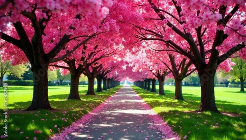 © Theerawat, Naklejka premium Deserted path lined with blooming pink crabapple trees Rainey Park, Astoria, spring , flower, astoria