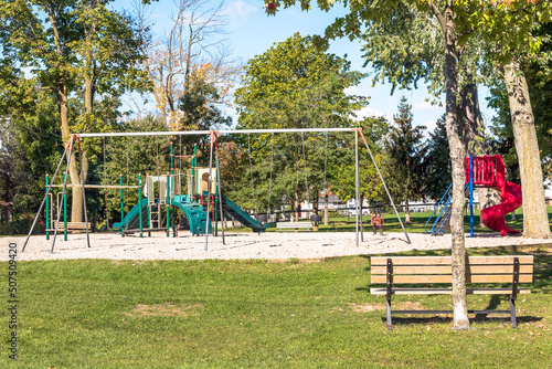 Fototapeta premium Deserted playgrond for children with slides and swings in a public park on a sunny autumn day