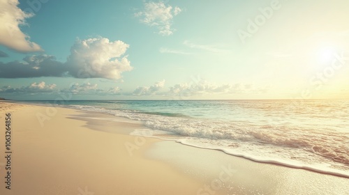 Fototapeta premium Deserted sandy beach along a summertime ocean featuring ample negative space...
