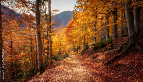 © Gavin, Obraz premium Deserted Trail Through A Deciduous Forest In The Mountains In Autumn