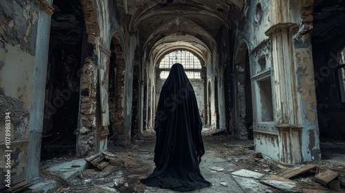 © Vitalii But, Naklejka premium deserted vintage castle spectral widow cloaked black dress and veil glides silently embodying eerie essence Halloween decayed atmosphere.