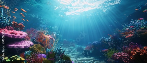 Fototapeta premium Design a CG 3D collage of a surreal underwater scene, incorporating vibrant coral reefs, exotic fish, and shimmering rays of sunlight filtering through the water