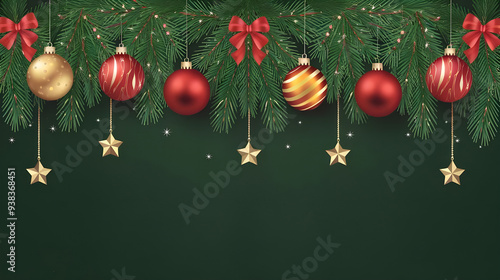 © Design Gallary, Naklejka premium Design a Christmas-themed banner with hanging golden ornaments, pine cones, gift boxes, and lush green pine needles against a dark green backdrop, giving a sense of holiday cheer.