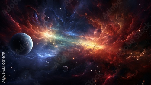 © Hameed, Obraz premium Design a 3D abstract representation of a cosmic collision, with celestial bodies merging and exploding in a vibrant display.