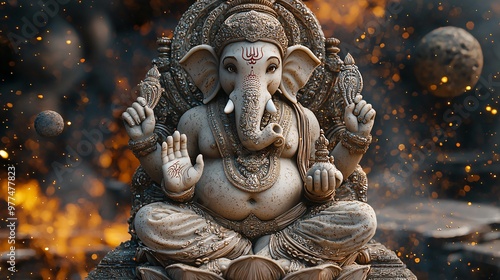 Fototapeta premium Design a 3D image of Ganesh on a cosmic lotus floating in space, with stars and planets in the background