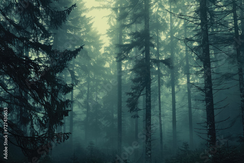 Obraz premium Design a mystical forest with towering trees and a foggy atmosphere