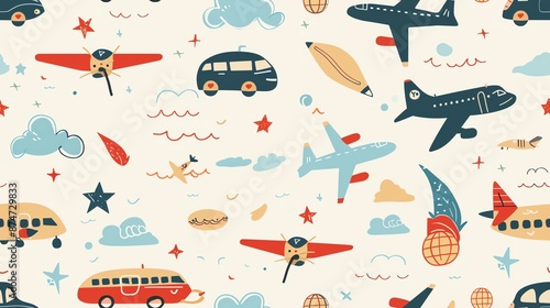 Naklejka premium Design a seamless pattern with transportation motifs like airplanes, cars, and trains