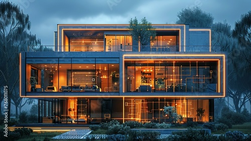 © Jennifer, Obraz premium Design concept of a smart building. Engineering of smart building's autonomous control system. Communication design of an apartment house. Architectural drawing, blueprint of its facade