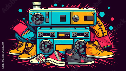 Fototapeta premium Design 80s-themed online clothing store logo , roller skates, cassette tapes.