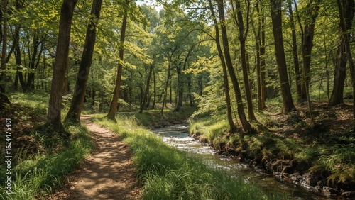 Naklejka premium Design showcasing a natural trail in dense forest with a stream flowing at the side, abstract summer nature background