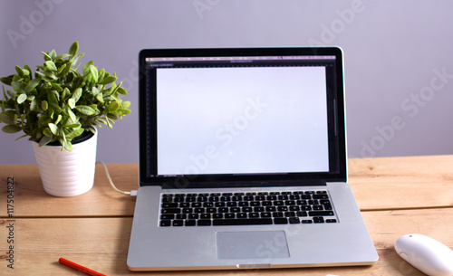 © lenetsnikolai, Fototapeta premium Designer working desk with computer and paperwork