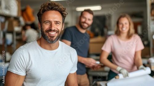 © LifeMedia, Obraz premium Designers collaborate on innovative textile printing in a vibrant classroom