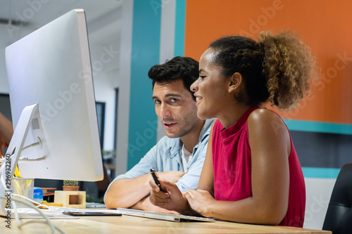 © Teerawut, Obraz premium designers team working modern. creative manager showing new project idea monitor.