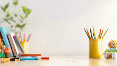 Obraz premium Desk equipment, crayons, pens School banner, white background, pure pastel colors, school accessories arranged on the desk.