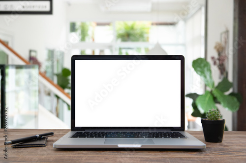 Fototapeta premium Desk Laptop with blank screen on table