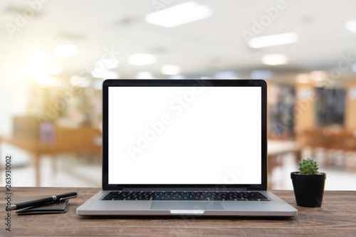 Fototapeta premium Desk Laptop with blank screen on table