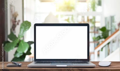 Fototapeta premium Desk Laptop with blank screen on table