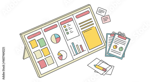 © MdAzgor, Fototapeta premium Desk presentation board with charts and papers graphs