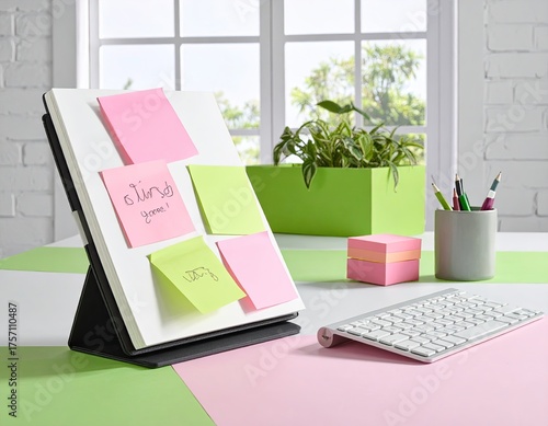 Naklejka premium Desk scene Notes, keyboard, plant, serene, colorful