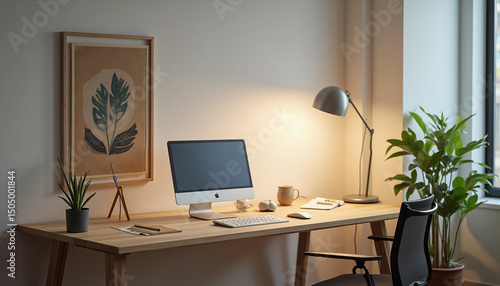 Fototapeta premium Desk setup with computer, plant, art and lamp