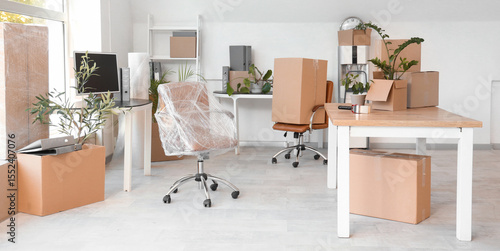 Obraz premium Desks with chairs and cardboard boxes in office on moving day