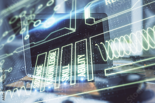 Obraz premium Desktop computer background and education theme drawing. Double exposure. Study concept.