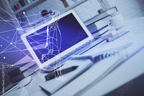 Fototapeta premium Desktop computer background in office and start up theme hologram drawing....