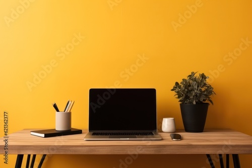 © Margo_Alexa, Obraz premium desktop with flower, notebook and office supplies on a colored background.Generative AI
