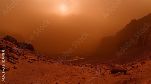 Naklejka premium Desolate desert landscape with a large rock formation in the foreground. The sky is orange and the sun is setting