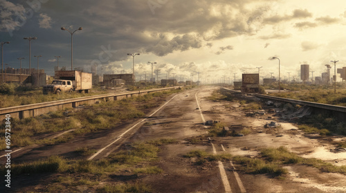 Fototapeta premium Desolate highway with overgrown ruins under a stormy sky.