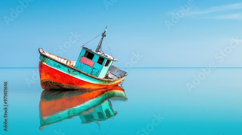 © Dee, Fototapeta premium Desolate Memories: Abandoned Fishing Boat Sinking Into the Sea Symbolizing Neglect and Forgotten Dreams