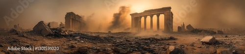 Fototapeta premium Desolate ruins of an ancient cultural site with fallen columns and scattered...