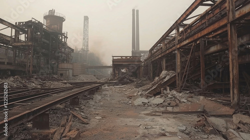 © Gun, Fototapeta premium Desolate Steel Mill Ruins with Rusted Beams and Collapsed Structures Amidst Gloomy Atmosphere