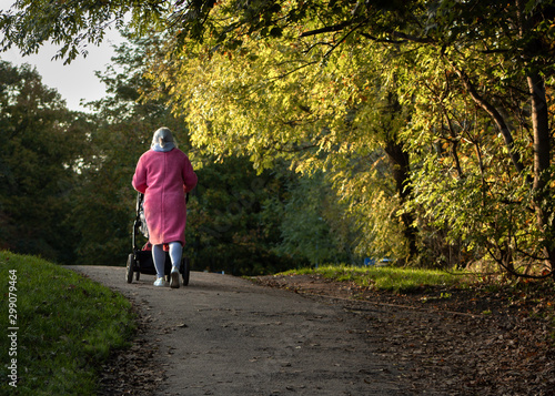 © Richard, Fototapeta premium Despite the autumn sunshine a woman wraps up warm in a pink coat when taking a child in a pushchair on the tow path of the Leeds & Liverpool Canal at Hirst Wood