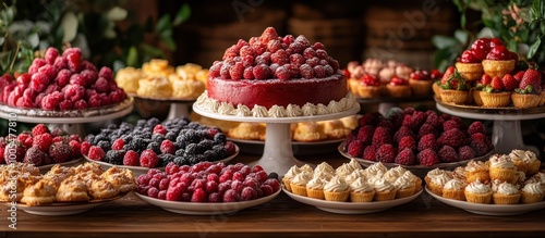 Fototapeta premium Dessert table with raspberries, cakes, and pastries.