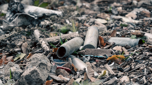 © Sofiia, Fototapeta premium destroyed and burned houses in the city in Ukraine