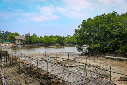 Fototapeta premium Destroyed bamboo bridge across the river to the Morgan village.