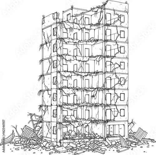 Obraz premium Destroyed building with broken walls and debris, clean black lines, with hand-drawn style