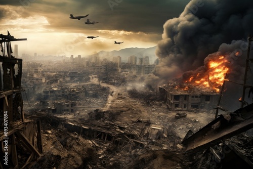 © Rawpixel.com, Obraz premium Destroyed city smoke fire sky.